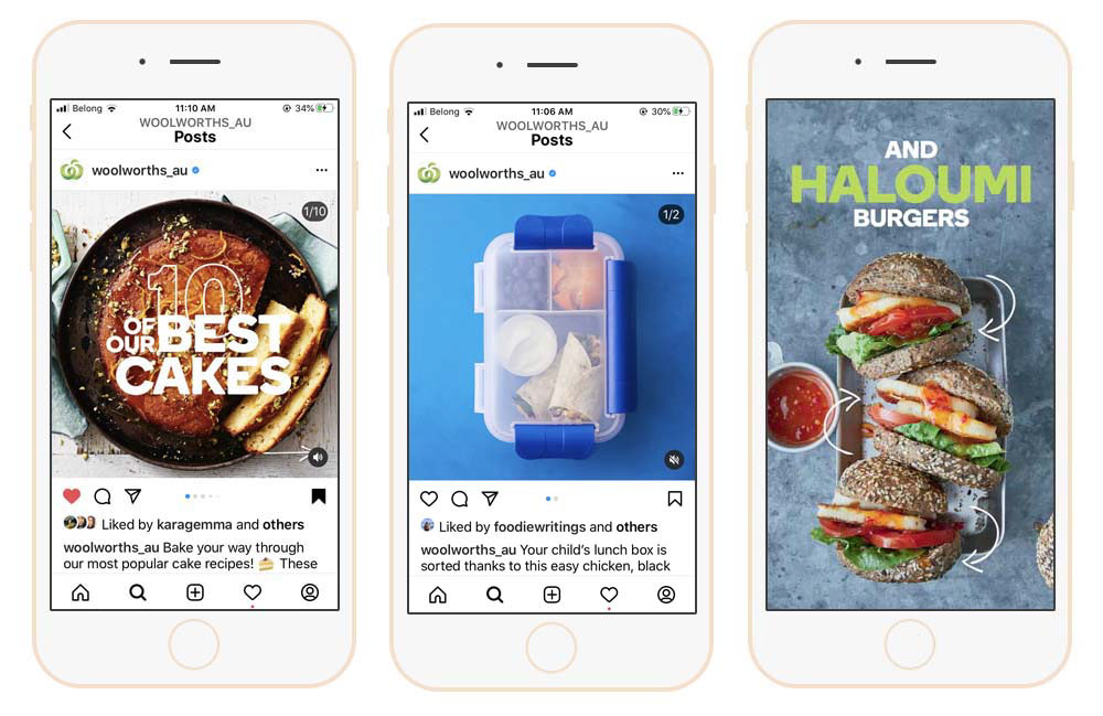 Various Instagram posts created for Woolworths Fresh food campaigns. All animated, they have increased Woolworths views on Instagram YOY in 2021.
