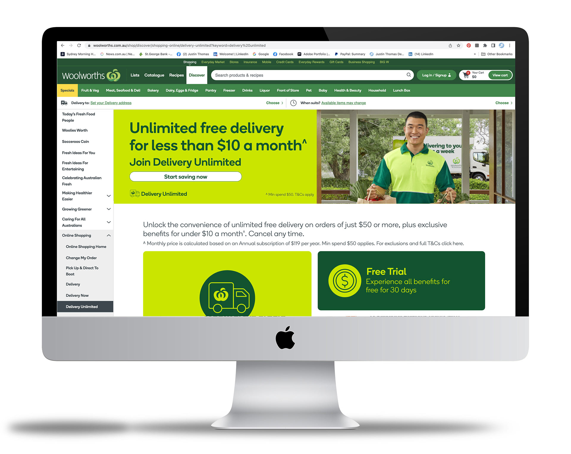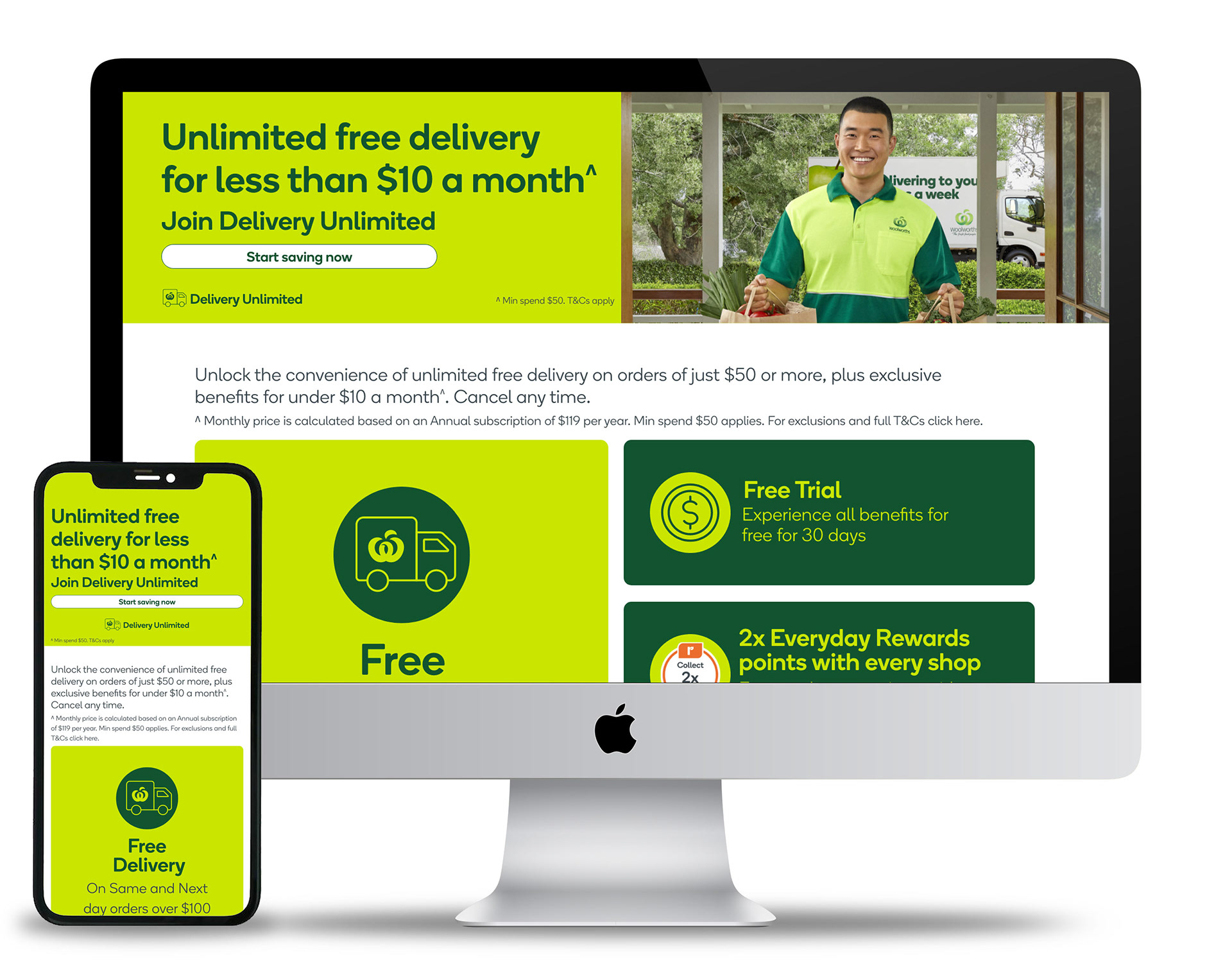 Designs for Woolworths Delivery Unlimited Landing Page. Web and Mobile pages designed for the Woolworths Website, created in Adobe XD.